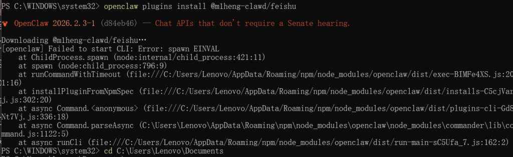 在clawbot安装飞书插件,记得切换到用户目录安装cd C:\Users\Lenovo\Documents